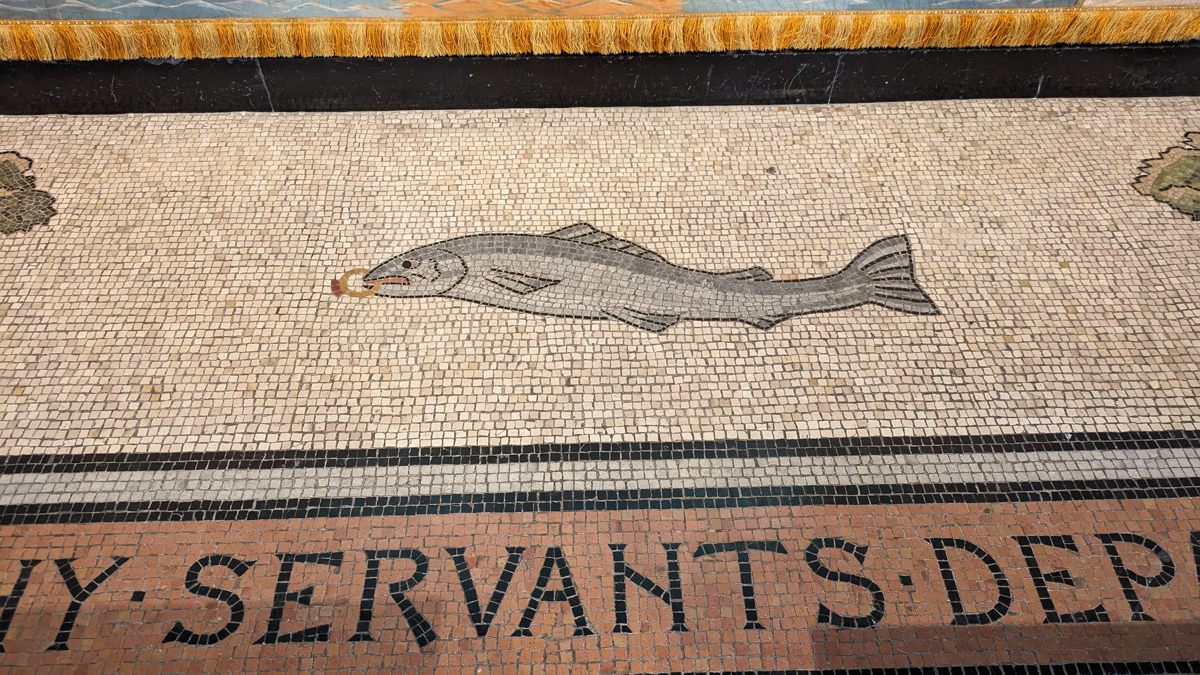 The church features the repeating themes representing the four miracles performed by St Kentigern: a tree, a robin, a fish with a ring in its mouth, and a bell.
